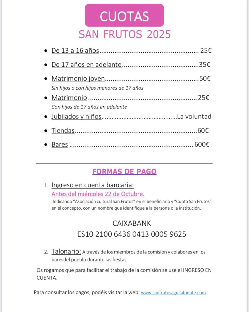 Os dejamos el cartel con las cuotas de este San Frutos. Podéis hacer el ingreso en la cuenta bancaria hasta el miércoles 22 de octubre.